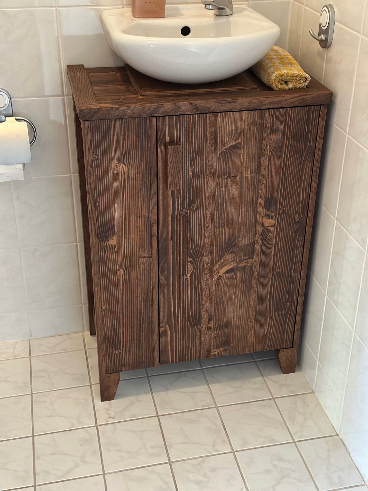 Het meubel sluit perfect aan onder de wasbak, die hierdoor (bijna) geïntegreerd lijkt in het meubel.