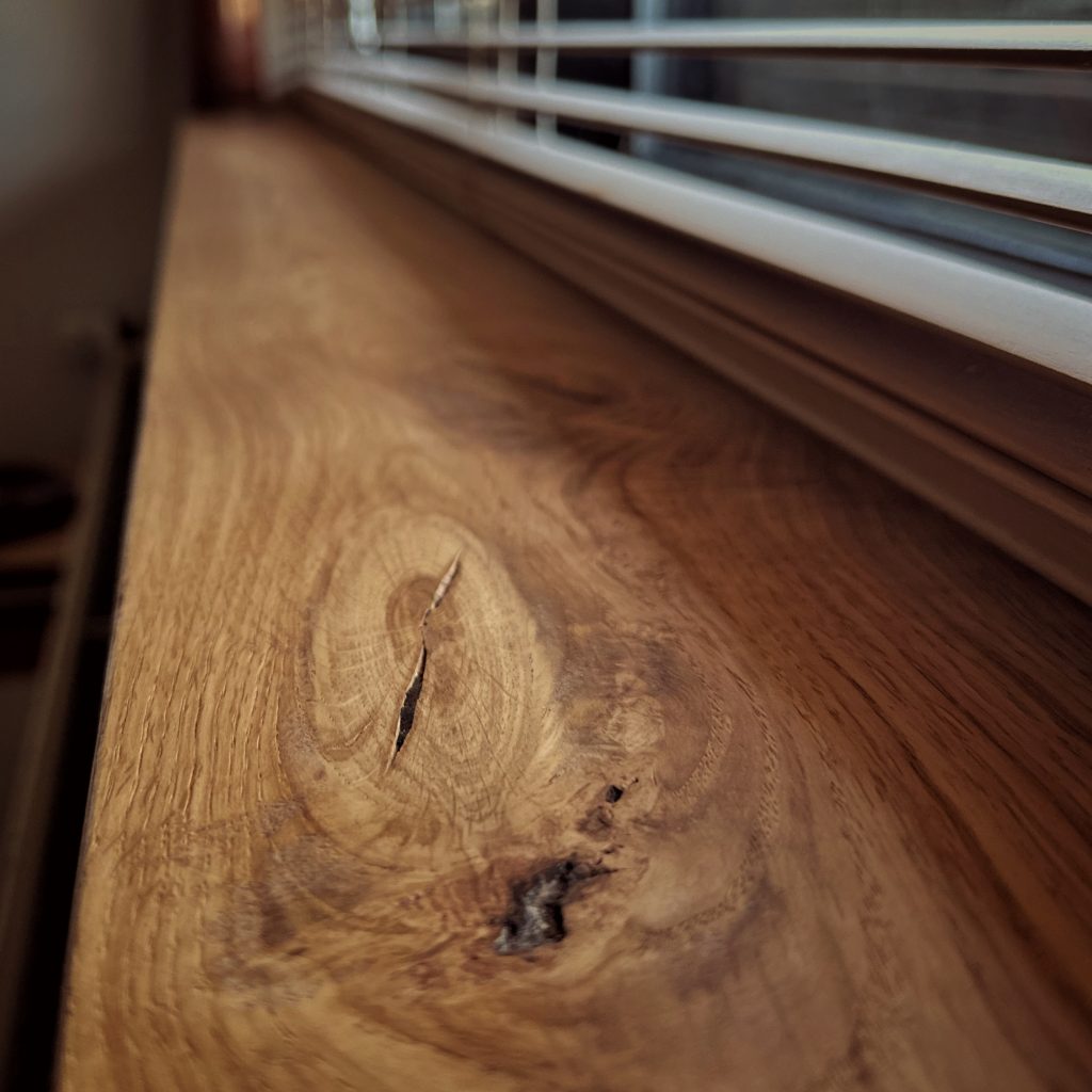 Wanneer de vensterbank uiteindelijk op zijn plek ligt, wordt duidelijk waarom dit werk de moeite waard is. Het hout geeft het naar binnenvallende licht een warme gloed. Een mooie verbinding tussen binnen en buiten. De reden waarom we gekozen hebben voor deze naam: Kizuna.