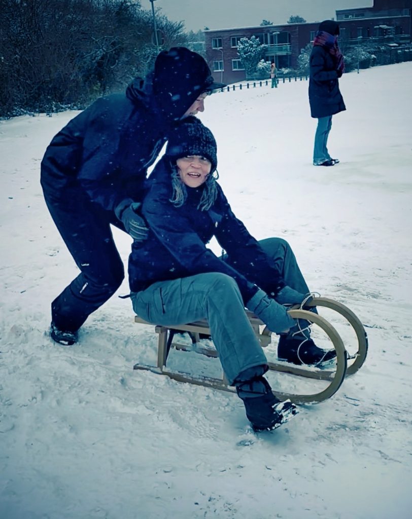 Met een kop koffie in de hand kijken we door het raam naar de neerdwarrelende vlokken. Dit soort dagen zijn zeldzaam. En dus doen we eerst wat bij dit moment past: we pakken de slee en gaan naar buiten. Spelen, lachen, vallen. Volwassen mensen op een houten sleetje. Op ons Instagram-kanaal hoor je Geraline het talud langs de A28 afglijden – een klein, licht absurd wintermoment, vastgelegd zoals het is.
